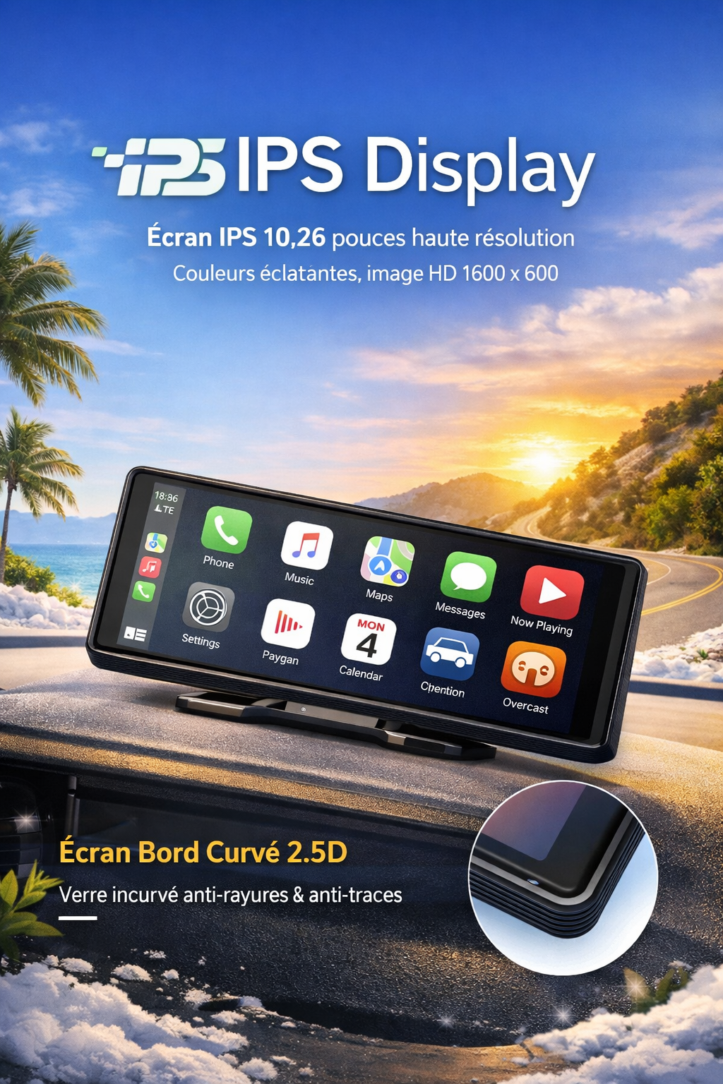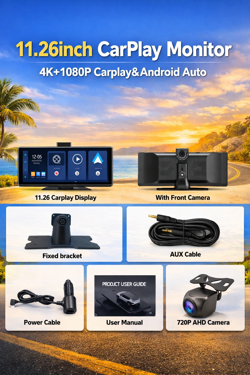 Écran CarPlay 11,26” Haute Définition – Grand écran tactile 4K + 1080P